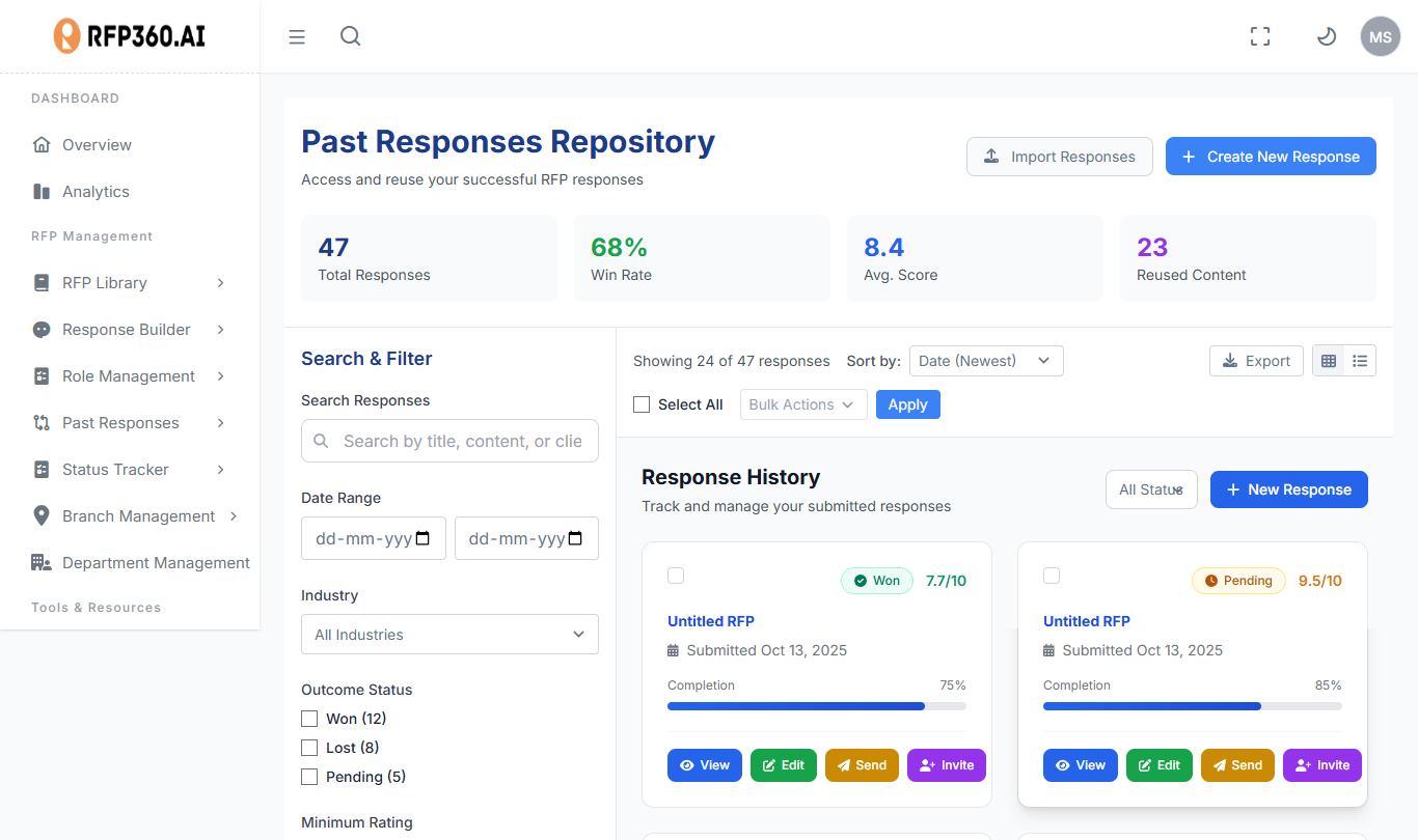 RFP360.ai is more than a proposal tool — it’s your end-to-end competitive advantage. From discovering the right opportunities and prioritizing the best bids to drafting high-quality responses and tracking engagement, RFP360.ai turns proposal management into a strategic growth engine.