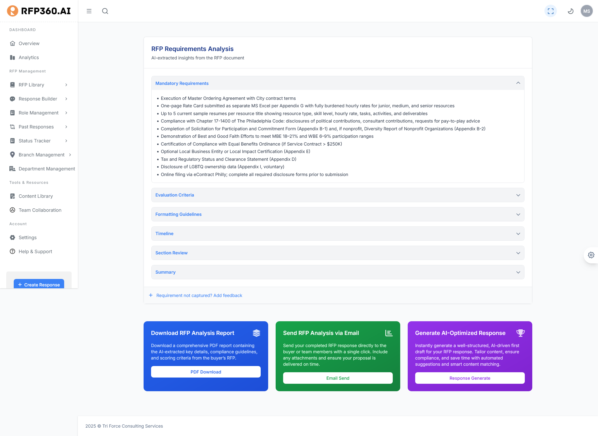 From building RFPs and managing vendor submissions to AI-assisted scoring and risk analysis, RFP360.ai simplifies every step — so your team can focus on value, not paperwork.
