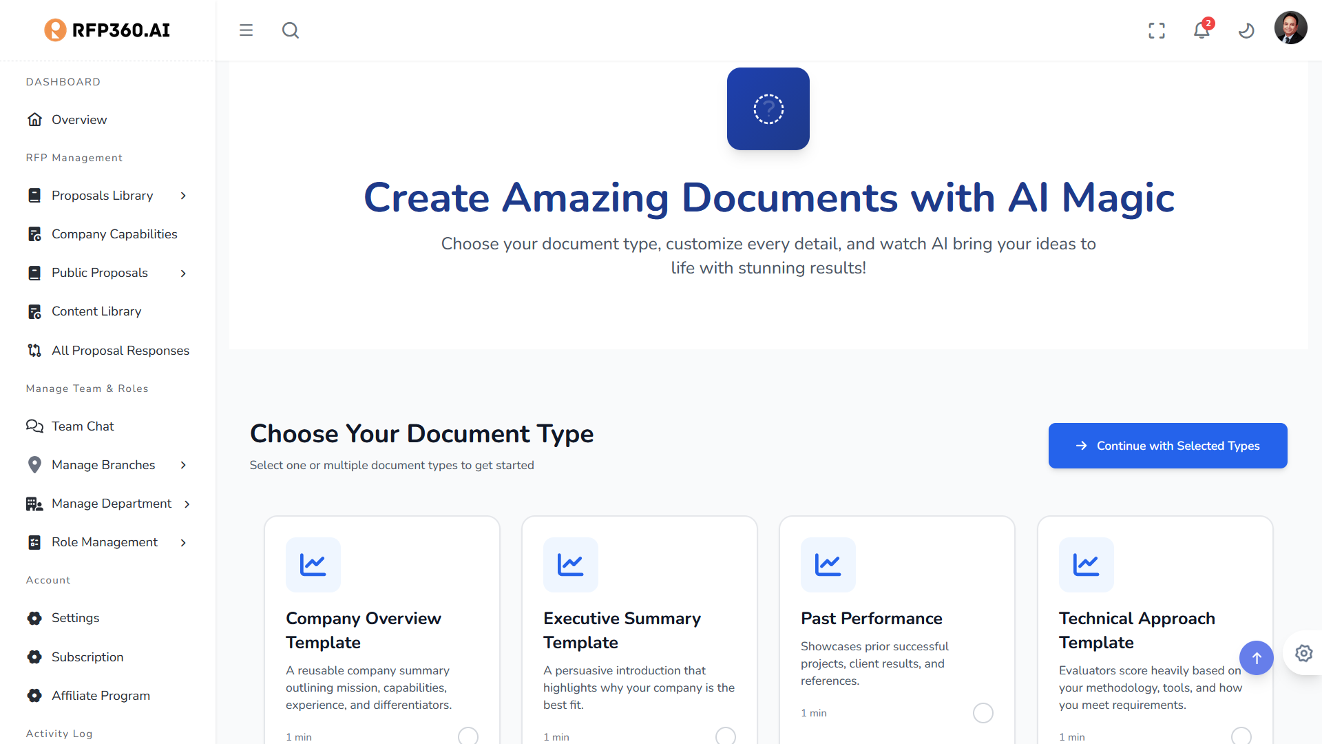 Stop starting from scratch. Utilize a central source of truth that doesn’t just store your data—it uses AI to generate, customize, and organize your winning documents in seconds.